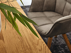 Even if the dining tables and chairs from this series inspire with their design – they are not exhibition pieces, but should be used. Every single day. By you, your family and good friends. Made of robust oak, the TAMINA table tops can therefore withstand a lot while retaining their natural charm for many years. The chairs also set pleasant highlights with different fabric and leather covers as well as offering incomparable seating comfort.