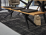 Gutes Design ist nicht oberflächlich. Deshalb sind die Esszimmertische aus unserem Programm TAMINA auch unterhalb der Tischplatten einen zweiten Blick wert. Denn hier befinden sich trapezfömige Tischbeine aus schwarzem Eisen, die den massiven Eichentischen sicheren Halt und Stabilität verleihen. Ein Designelement, das auch den Schalenstühlen und Sitzbänken der Serie ihren besonderen Look verleiht.