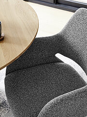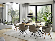 Hochwertige Bezüge aus Bouclé oder Microfaser verleihen den TARIO-Stühlen eine besondere Haptik und hohen Komfort. Für maximale Flexibilität am Tisch sorgen die um 180° drehbaren Gestelle mit Rückholfunktion. Bei der Tischplatte hast du die Wahl zwischen runden und rechteckigen Ausführungen in drei charakterstarken Eichevarianten. Ob Platte, Tischgestell oder Stuhlbeine: Alle Elemente sind so ausgeführt, dass die Materialien optisch perfekt ineinandergreifen.