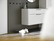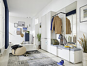 Eingangsbereich, Garderobe und Stauraum: Der Flur oder die Diele sind echte Multitalente, die gleich mehrere Aufgaben auf einmal erfüllen und dabei auch optisch begeistern. Denn clevere Möbelelemente wie die komfortable Sitzfläche geben dem Flur einen wohnlichen Charakter und sind besonders dann praktisch, wenn es beim Ankleiden mal wieder etwas länger dauert – etwa, weil die Kinder erst noch die neuen Schuhe schnüren oder den Regenmantel überziehen müssen.