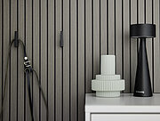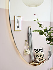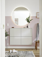 Unsere Serie KARA-FRAME-DIELEN bietet dir eine Vielzahl trendiger Lack- und Furnieroberflächen. Mit Deepline kannst du ihnen eine interessante Struktur verleihen, wie an den vertikalen Rillen in den Garderobenpaneelen zu erkennen ist. Taschen finden an einem der Haken ihren Platz. Eine gute Ausstattungsidee sind außerdem ein runder Spiegel und eine Garderobenstange. Dazu noch einige Korpuselemente für den Stauraum – fertig ist das einladende Entrée.