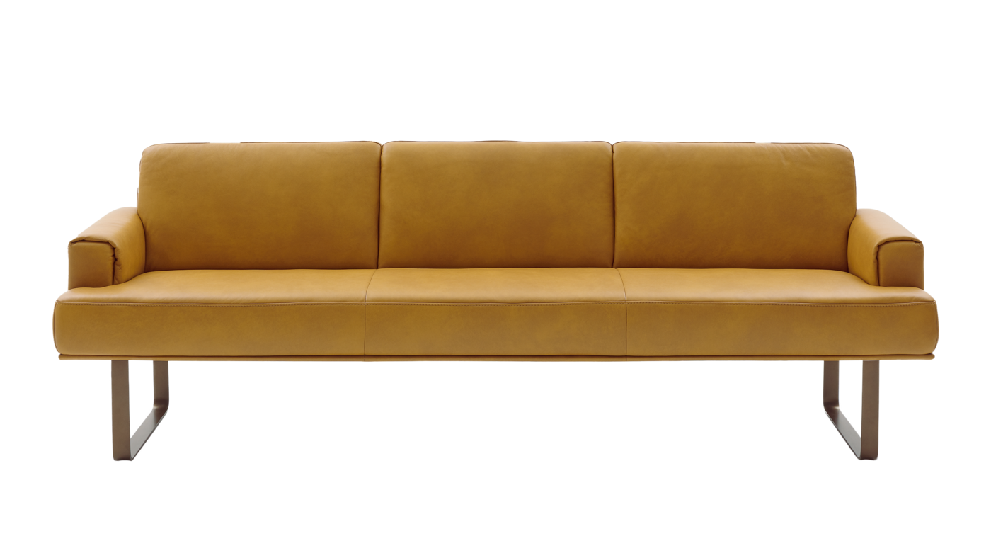 Besonders gefragt ist die Garnitur im Leder „kurkuma“ mit seinem frischen Curryfarbton. Die Füße sind in fünf verschiedenen Metallfarben erhältlich – darunter ist vor allem der Bronzeton sehr beliebt. Außerdem schätzen Kunden die Armlehne mit ihrem charakteristischen Überschlag.